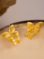 Turn heads with the radiant charm of these dual butterfly earrings, meticulously crafted in a rich 18K gold-plated finish. Inspired by the grace of butterflies in flight, these earrings capture a perfect balance of elegance and nature, transforming your everyday or festive wear into a moment of beauty and meaning. The raised texture on the wings adds lifelike detailing, making this a captivating statement piece you’ll adore.
